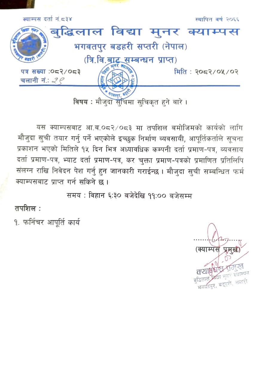 यस सूचनामा उल्लेखित शर्त तथा मापदण्ड पूरा गर्ने इच्छुक आपूर्तिकर्ताले मात्र क्याम्पसमा निवेदन दिन सक्नेछन्।